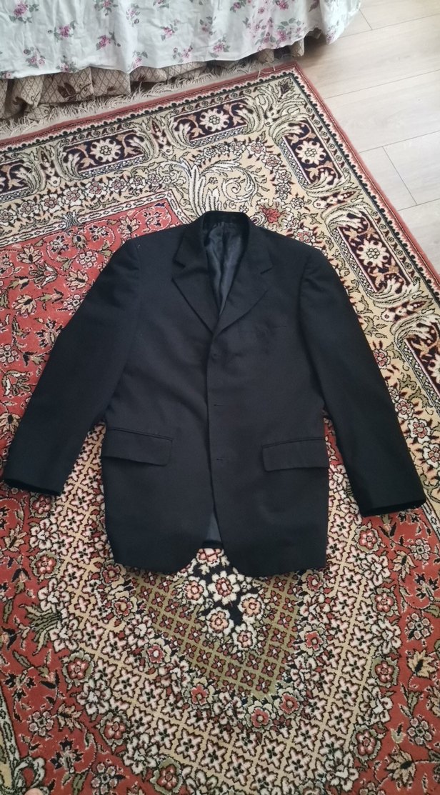 Düğmeli, siyah erkek takım ceketi, klasik kesim ve kesilmiş yaka tasarımıyla ofis kullanımı için uygundur. Uzun kolludur ve desensizdir. ️