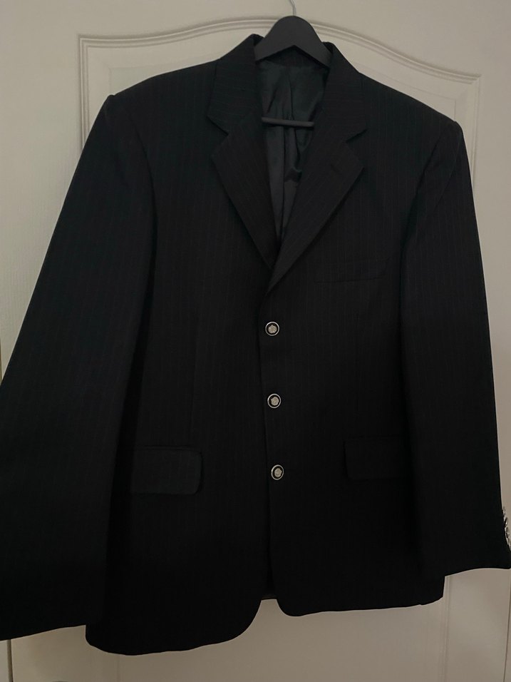 Düğmeli, klasik kesim siyah erkek takım ceketi, uzun kollu ve yakası notched lapel. Midi boyda, ofis için uygun sade ve şık tasarım.