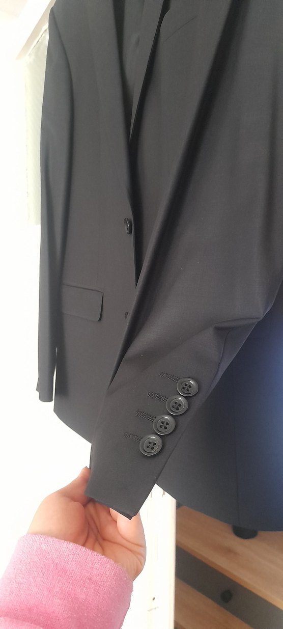 Düğmeli, sivri yaka ve uzun kollu siyah erkek takım elbisesi. Düzenli kesimi ve kumaşıyla ofis için uygundur. ️