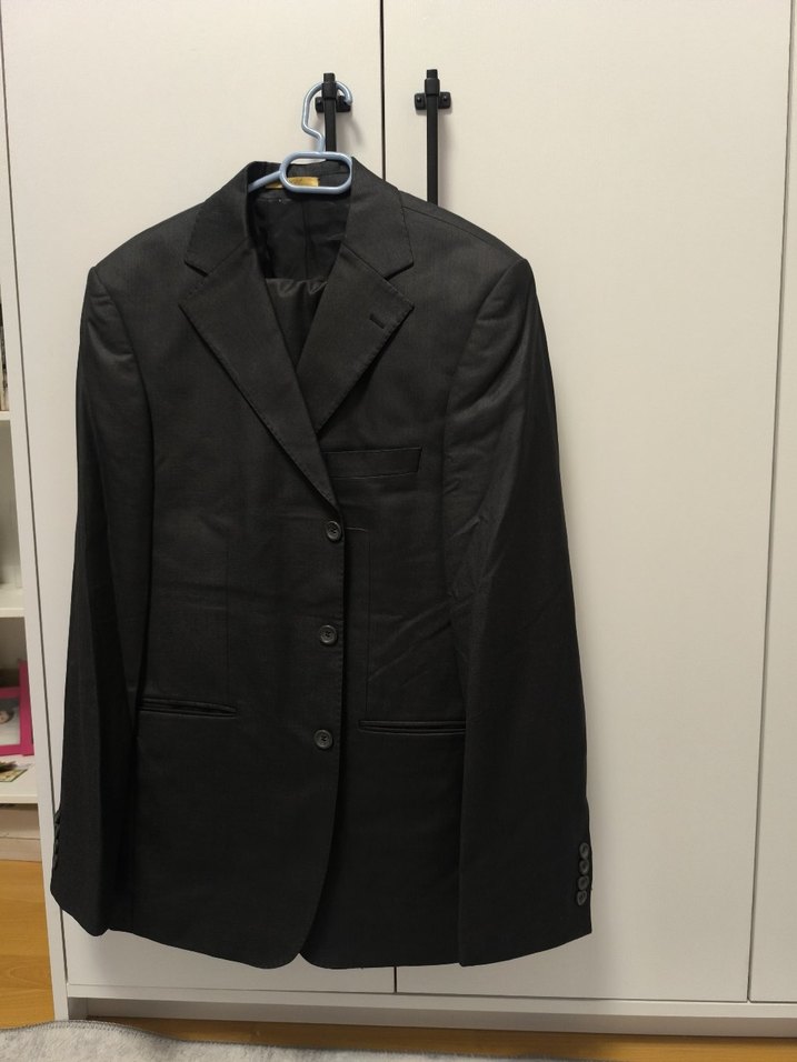 Düğmeli, siyah renkli, klasik kesim erkek takım elbisesi. Notch yaka ve uzun kollu, ofis için uygun sade tasarım.