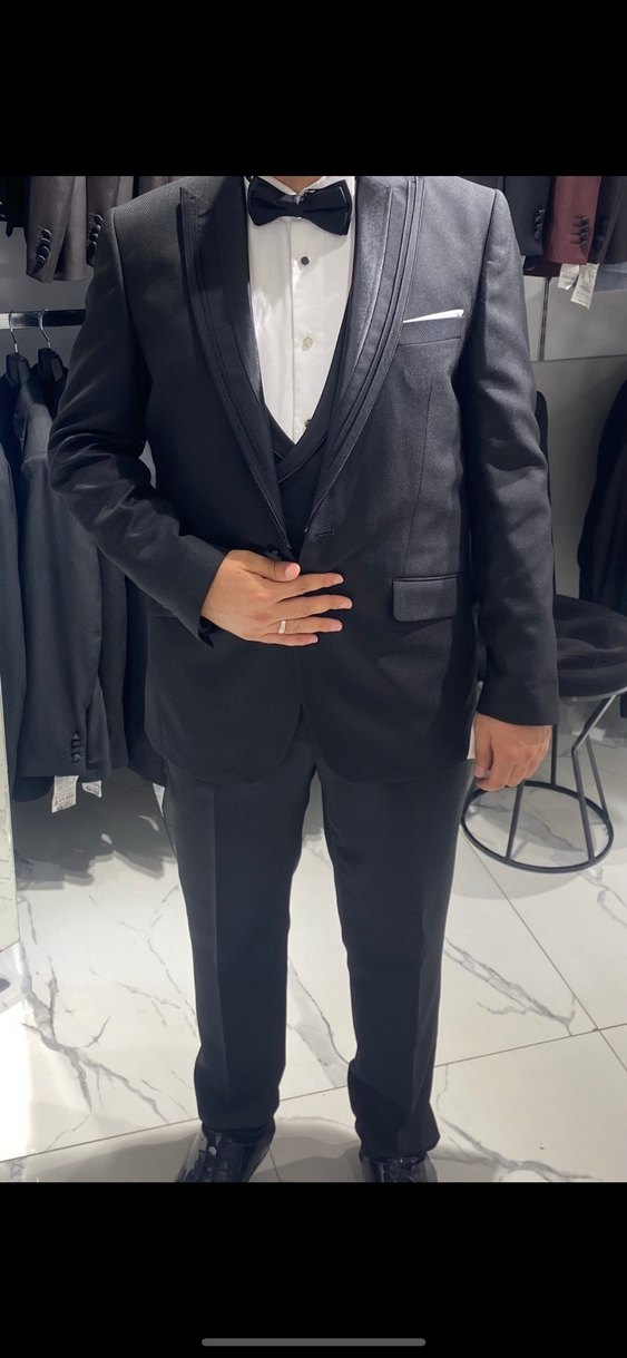 Düğmeli, ince detaylı siyah erkek takım elbise, normal boyda ve klasik kesimdir. Ofis ve iş ortamları için uygundur. ️ her şey dahildir