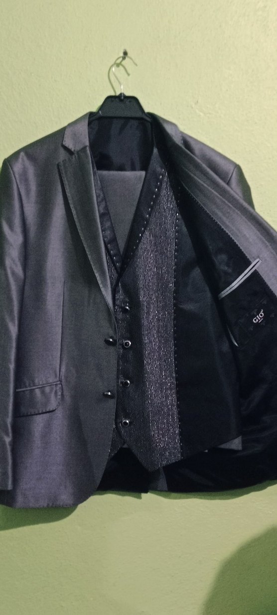 Düğmeli, siyah erkek takım elbise ceketi, kesik yaka ve uzun boylu, kolsuz tasarımıyla iş ortamına uygundur. tam takım damatlık sıfır ayarında