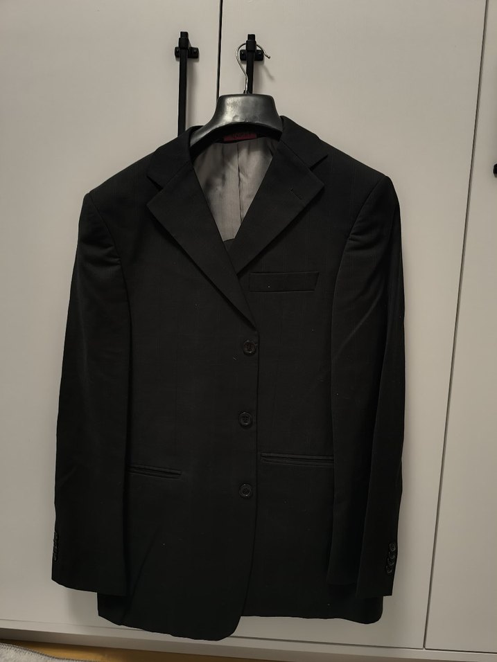 Düğmeli, siyah erkek takım elbise ceketi, klasik yaka ve uzun kolludur. Ofis için uygun, sade ve düzenli kesimlidir. ️