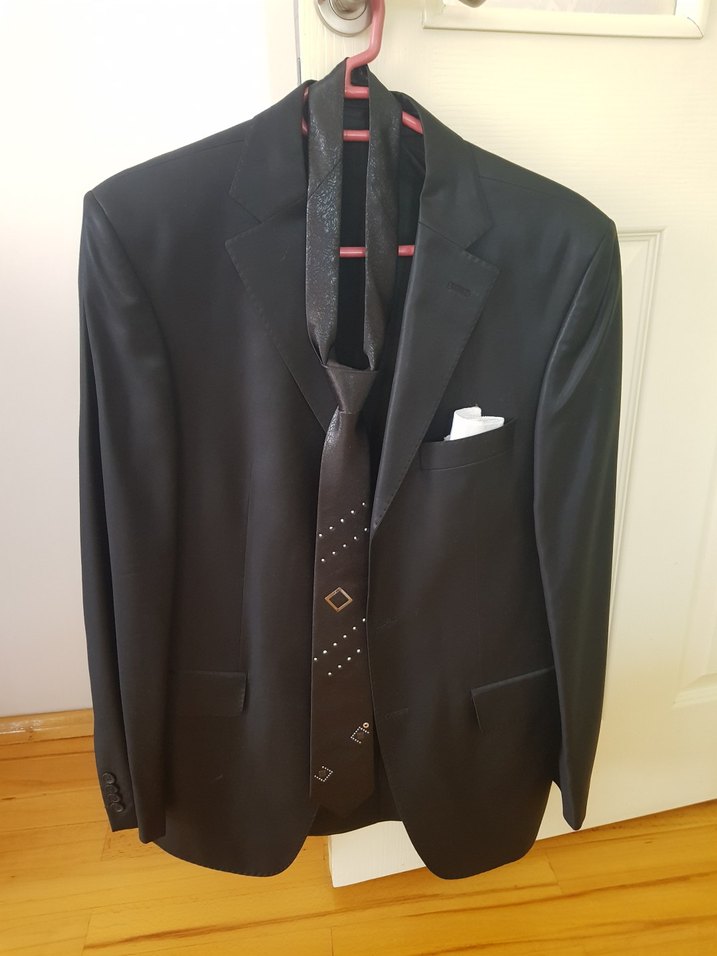 Düğmeli, notched lapel yakalı siyah erkek takımı, klasik ve iş ortamına uygun rahat kesimle tasarlanmıştır. ️