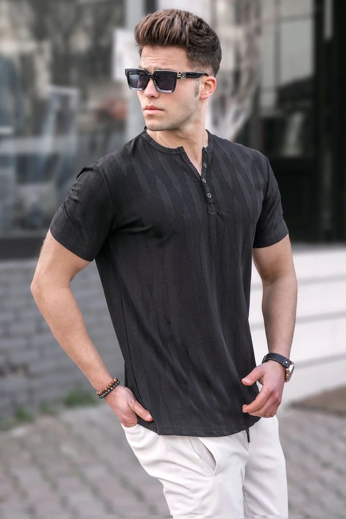 Düğmeli yuvarlak yakalı, kısa kollu siyah erkek tişörtü, rahat kesimi ve yumuşak sentetik kumaşıyla gündelik sokak stili için uygundur.