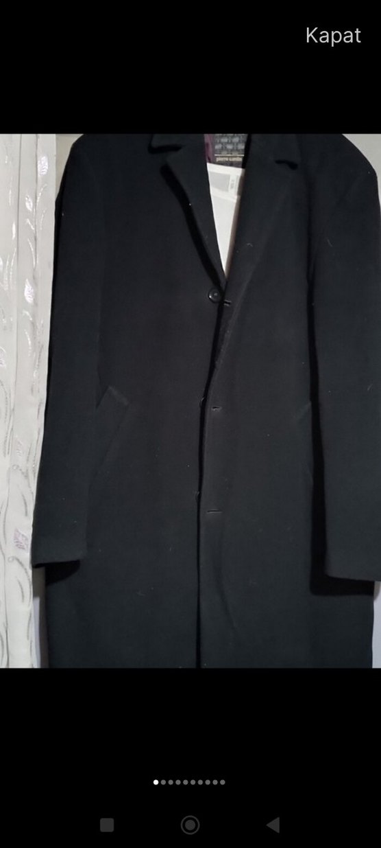 Düğmeli siyah erkek uzun kaban, yumuşak ve sıcak kumaştan, regular fit ve uzun kollu, ofis ve klasik sokak stili için uygundur.