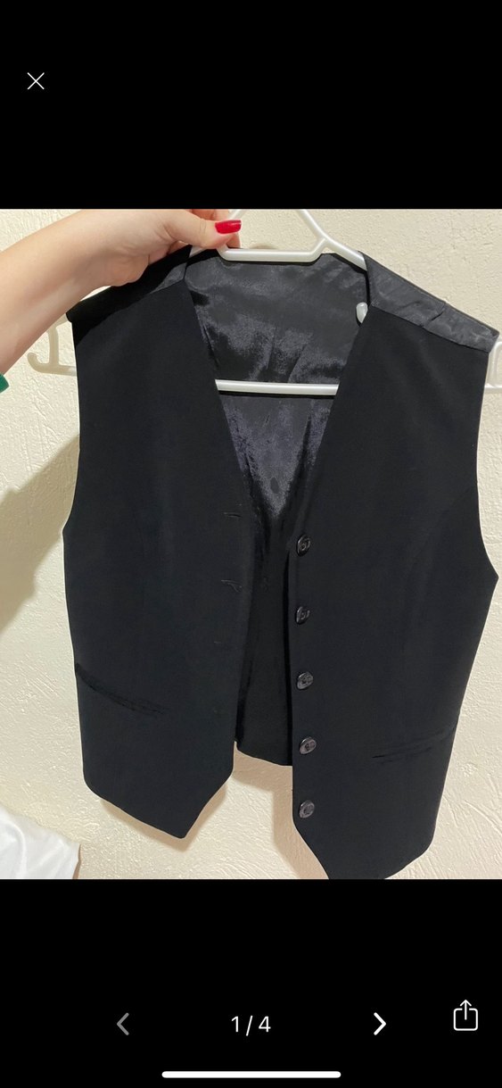 Düğmeli, siyah ve kolsuz bu yelek, kesimli yakaya ve düğmeli kapanışa sahiptir. İş ortamı için uygun, düzenli kesim ve sentetik kumaştan üretilmiştir.