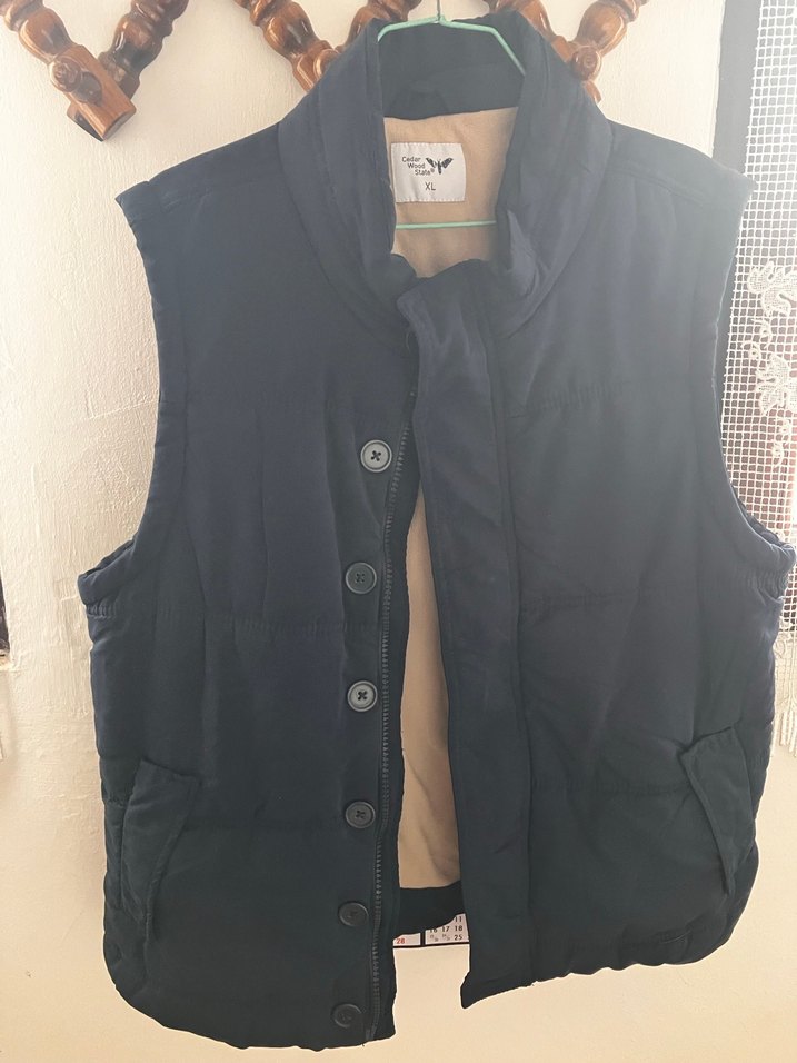 Düğmeli, yüksek yakalı lacivert erkek yelek, yumuşak ve sıcak kumaştan, midi boyda ve vücuda oturan kesimde. Günlük rahat sokak stili için uygun. İki kol arası 55 boy 70