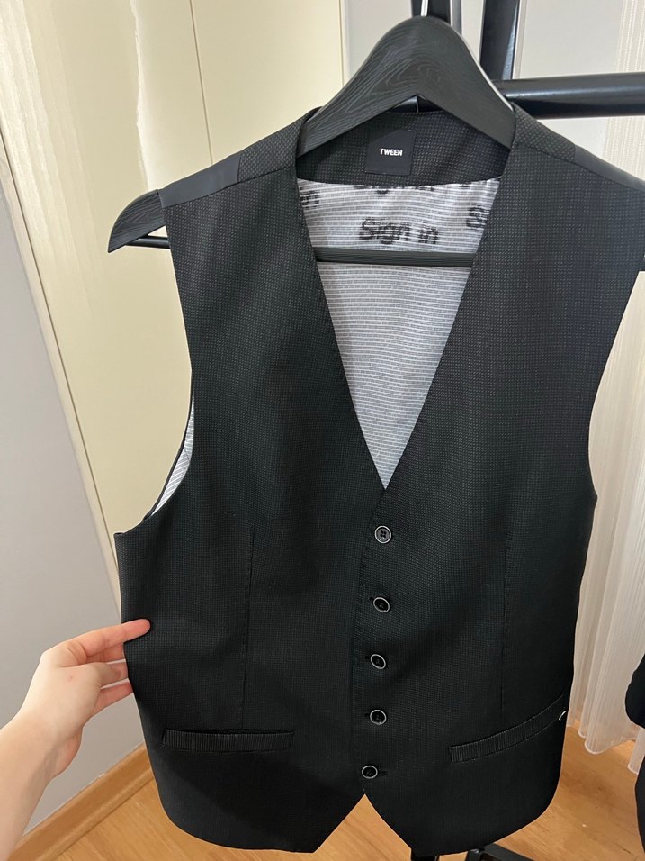 Düğmeli, siyah renkli, yakalı ve kolsuz erkek yelek. Sentetik kumaştan, normal kesim ve midi boyda, ofis ve sokak stili için uygun.