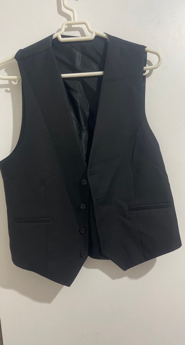 Düğmeli, yakalı siyah erkek yelek. Regular kesim, midi boy ve desen içermeyen sentetik kumaştan yapılmıştır. Ofis için uygundur.