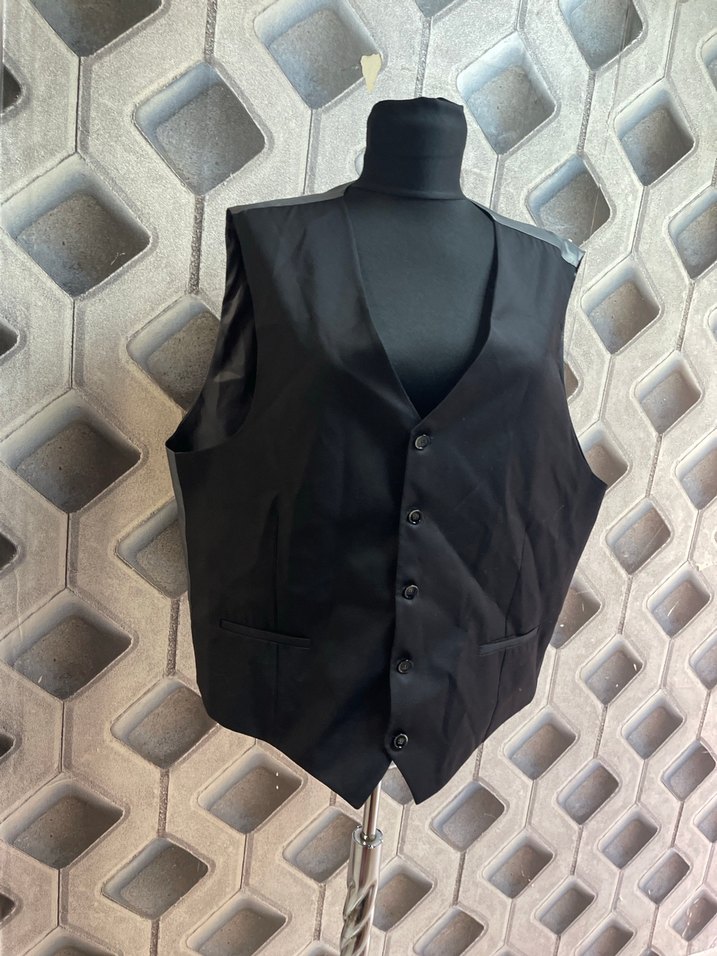 Düğmeli, notç yaka siyah erkek yelek. Sentetik kumaştan, regular fit ve kolsuz tasarım, ofis için uygun gotik tarzda.yünlü