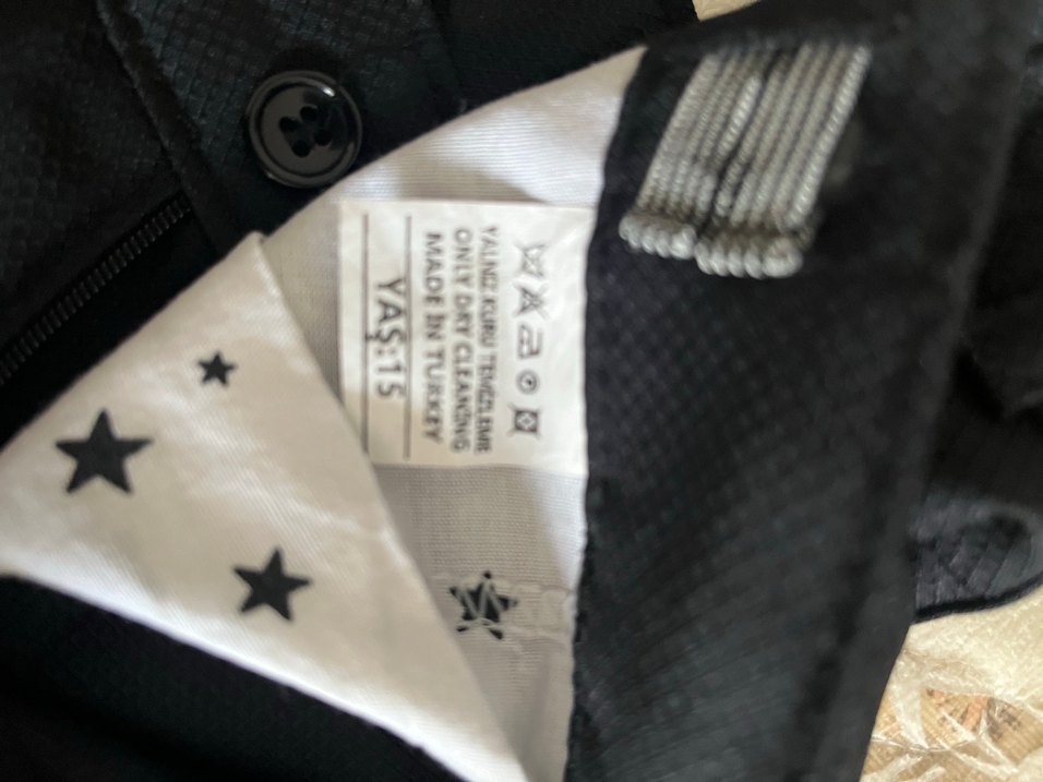 Düğmeli önü ve sivri yakası olan siyah, kolsuz erkek yelek, sentetik kumaştan, midi boy ve regular kesimdir. Ofis için uygundur.