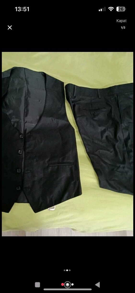 Düğmeli, siyah erkek yelek ve pantolon takımı.