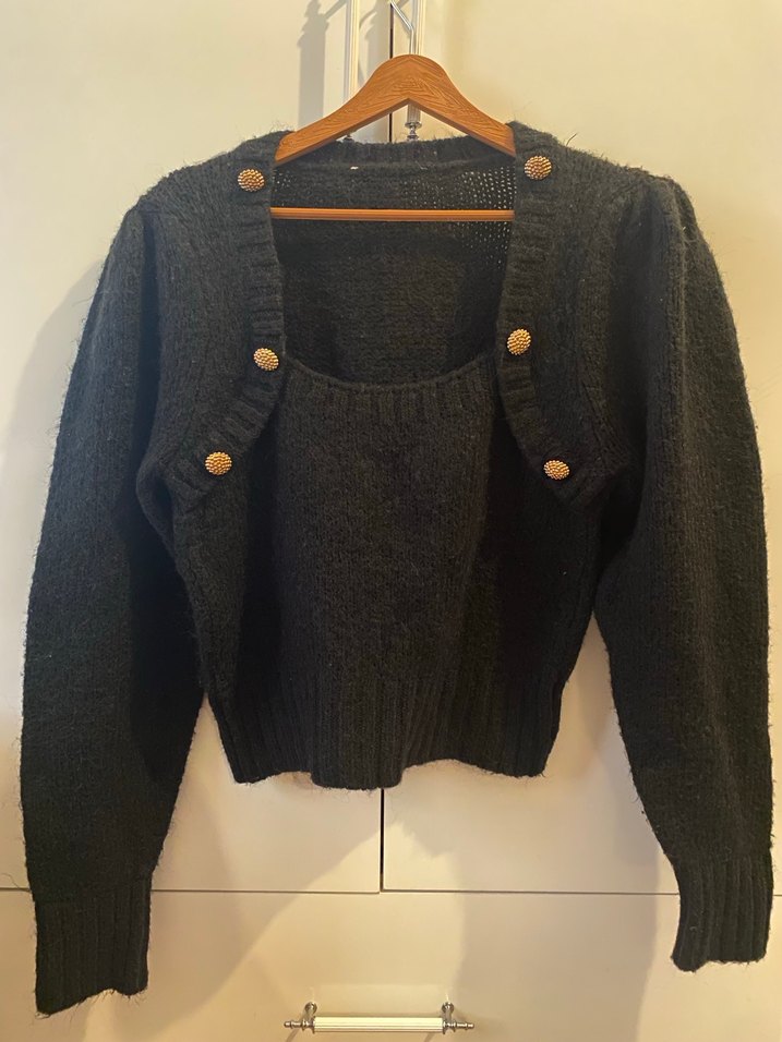 Gold Düğmeli, uzun kollu, siyah fitilli triko kazak. kare açık yaka. Balon kol model, sayılı kullanıldı bir sorunu yoktur. M bedene uygun