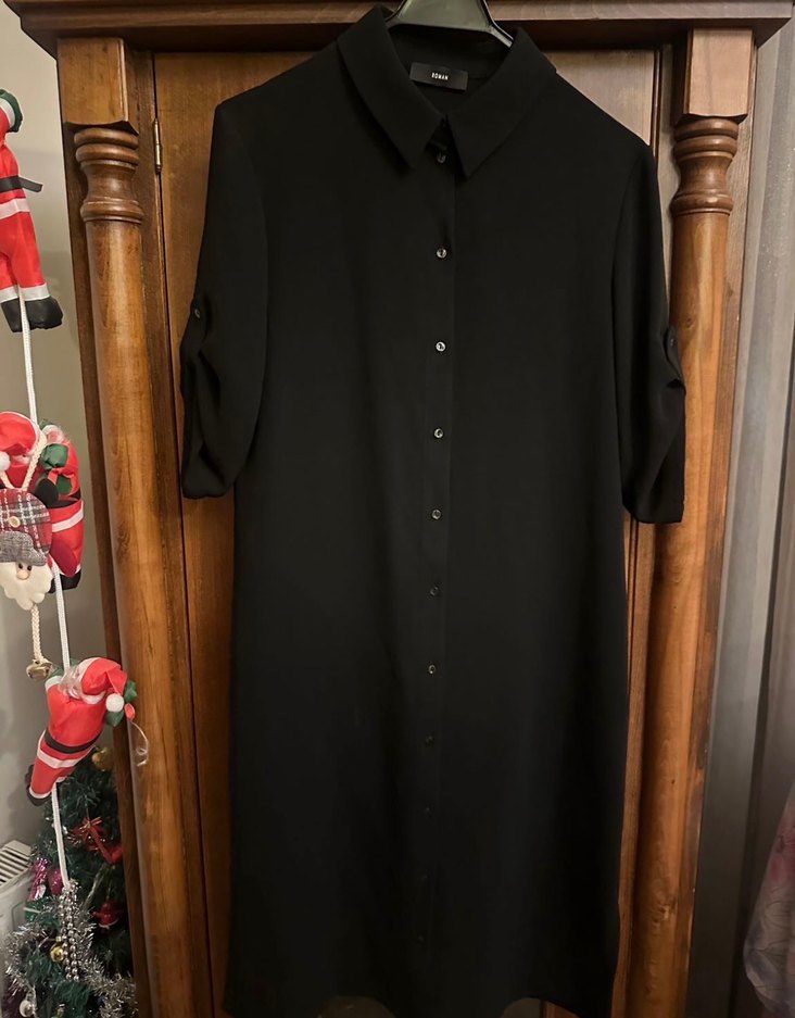 Düğmeli, yakalı ve kısa kollu siyah uzun gömlek elbise. Krep kumaştan, 3/4 kollu. Ofis ve günlük kullanım için uygun, rahat kesim.