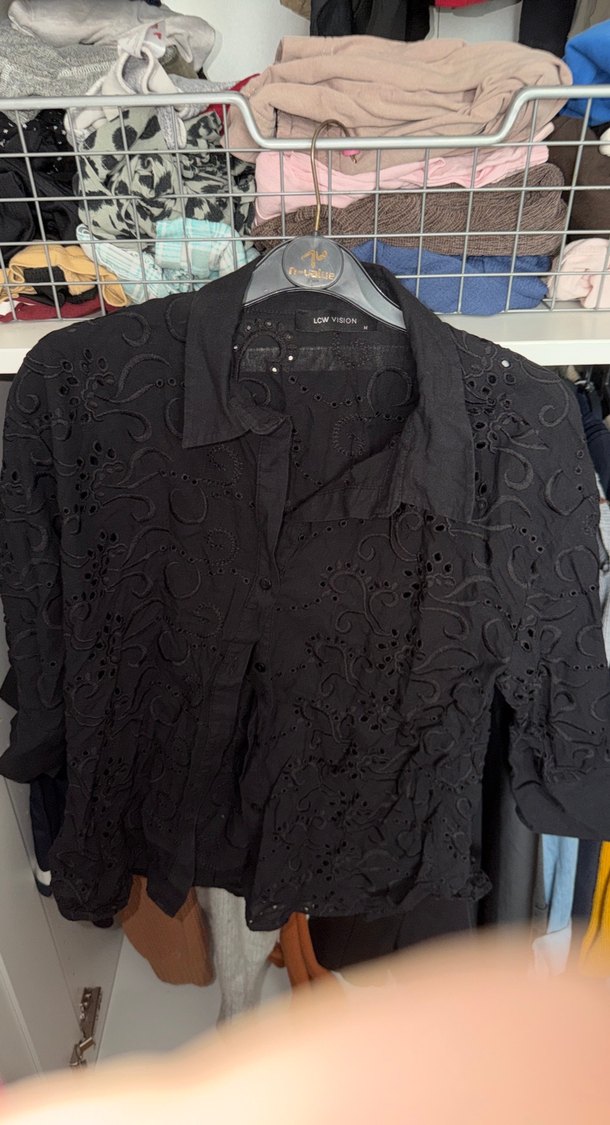 Düğmeli, desenli, uzun kollu, siyah keten gömlek. Rahat kesim ve normal uzunlukta, ofis için uygun gotik tarzda.