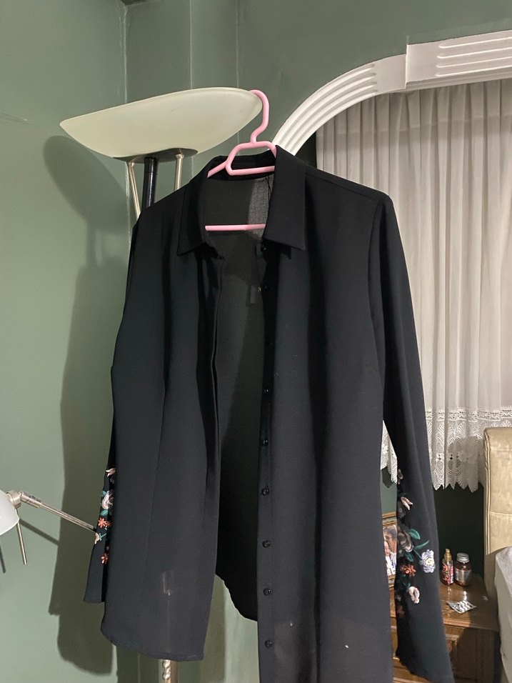 Siyah uzun kollu gömlek, notalı yaka ve düğmeli ön detaylara sahiptir. Sentetik kumaştan üretilmiş, kollarında baskılı desenler bulunur. Ofis kullanımı için uygun, rahat kesim ve gotik tarzda. Annem 20 yıl falan önce almış sanırım etiketi duruyor hiç giyilmedi İNANIR MİSİNİZ HİÇ GİYMEMİŞ 120₺ YAZIYOR YA ETİKETTE HİÇ GİYMEMİŞ HİÇÇÇÇÇÇÇ