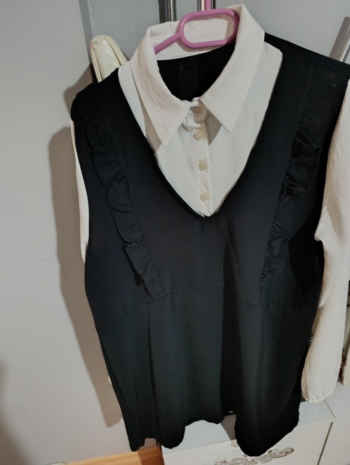 Düğmeli, yakalı ve regular fit . Siyah kolsuz dış katman ile beyaz uzun kollu iç gömlek kombinlidir. Günlük iş stiline uygundur.