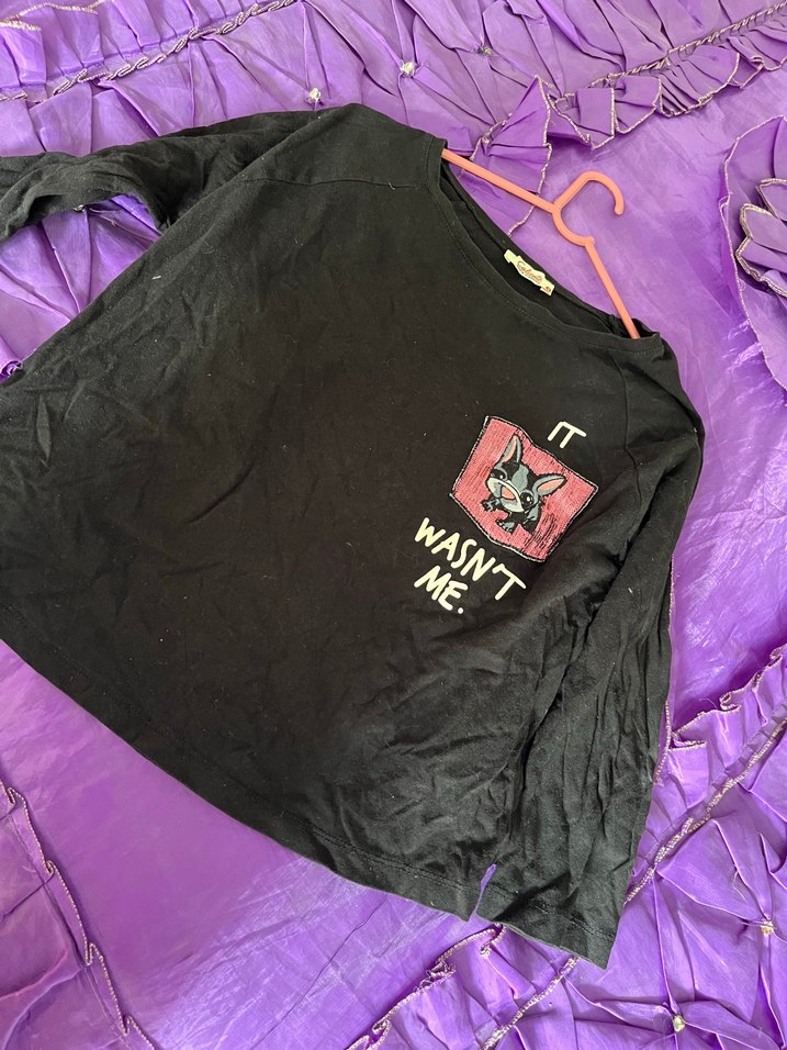 Düğmeli detaylara sahip siyah goth tarzı, baskılı kedi kıyafeti, koyu renklerle rahatlık sunar.