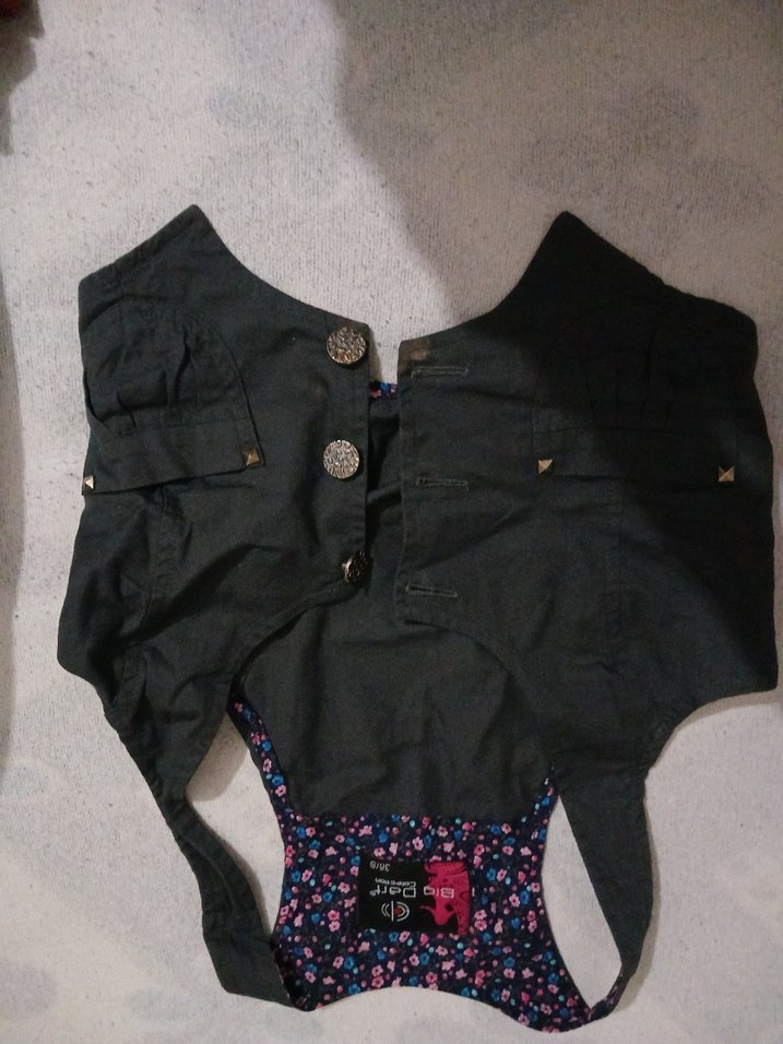 Düğmeli, siyah renkte gotik tarzda kıyafet İç kısmı çiçek desenli kumaşla kaplıdır.