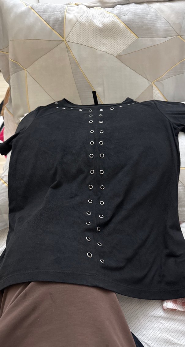 Düğmeli, tam oturan siyah hamile tişörtü, yuvarlak yaka ve önünde düğme detaylarıyla. Yumuşak sentetik kumaştan, kısa kollu ve normal boyda.