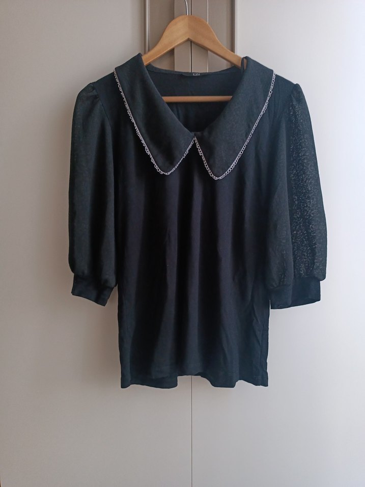 Düğmeli, pamuk kumaştan siyah bluz, kısa kollu ve geniş yakalı. Rahat kesimiyle günlük kullanıma uygun gotik tarzda.