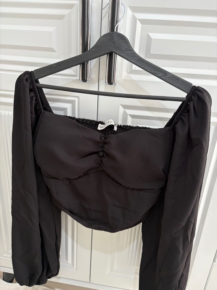 Düğmeli, kayık yakalı ve uzun kollu, sentetik kumaştan yapılmış siyah, vücuda oturan gotik tarzda bluz. Normal boyda, cesur günlük kullanım için uygundur.