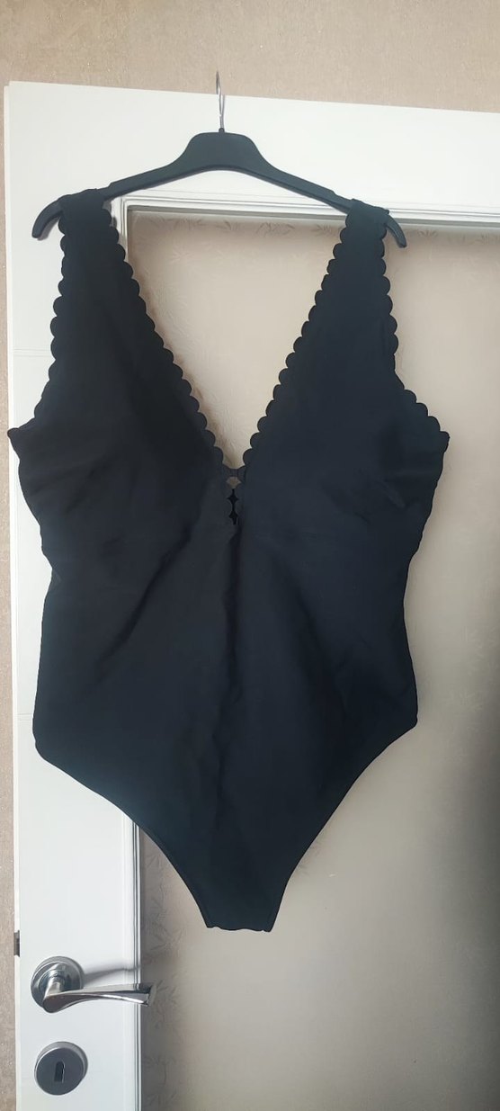 Düğmeli ön kısmı ve ince askılarıyla siyah, vücuda oturan gotik tarzda kadın mayo. Normal midi boyda, plaj için uygun.