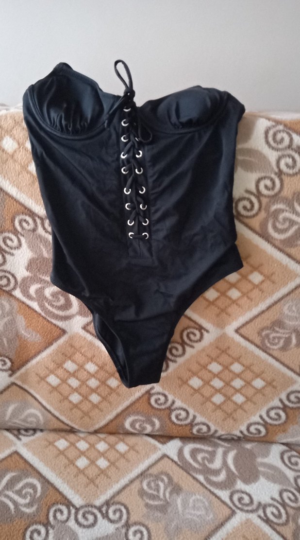 Düğmeli detaylı, askılı ve vücuda oturan siyah kadın mayosu, cesur gotik tarzıyla günlük kullanım için uygundur. 'GG' işaretlidir.