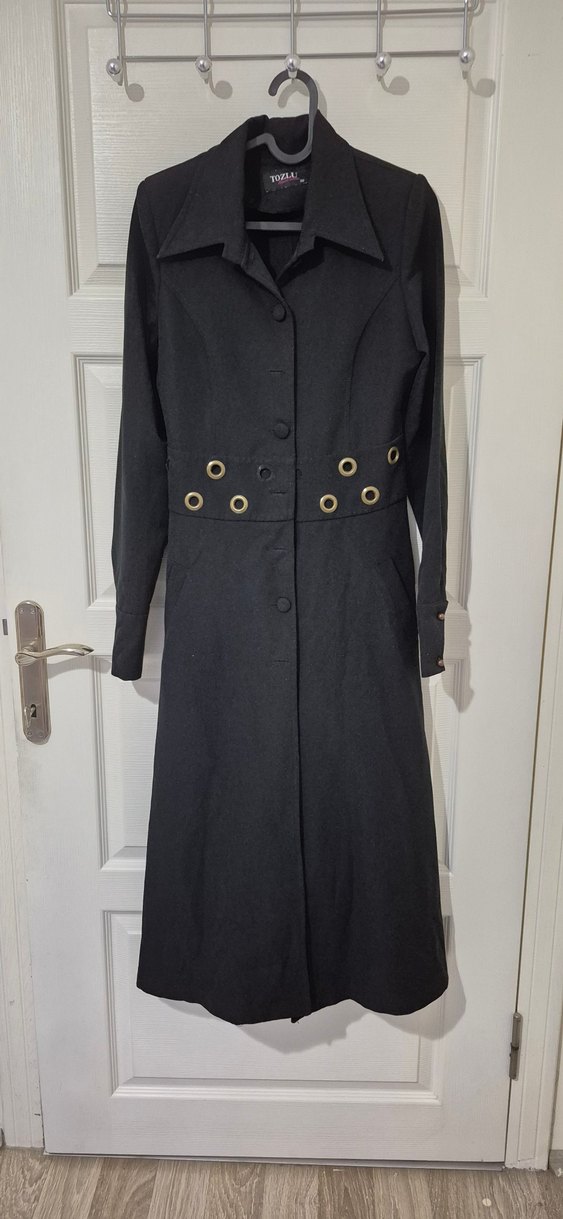 Düğmeli, siyah uzun kadın kaban, gotik stilde, regular kesim. Uzun kollu, yaka detaylı, belde metal halkalar var. Sentetik kumaştan, ofis kullanımı için uygun. kuşgözü detaylarından bir iki tanesi düşmüştür.