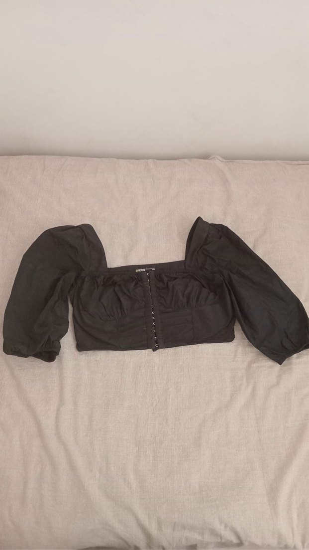 Düğmeli ön kısmı, tekne yaka ve uzun kollu, keten kumaştan yapılmış siyah, vücuda oturan gotik tarz bluz.
