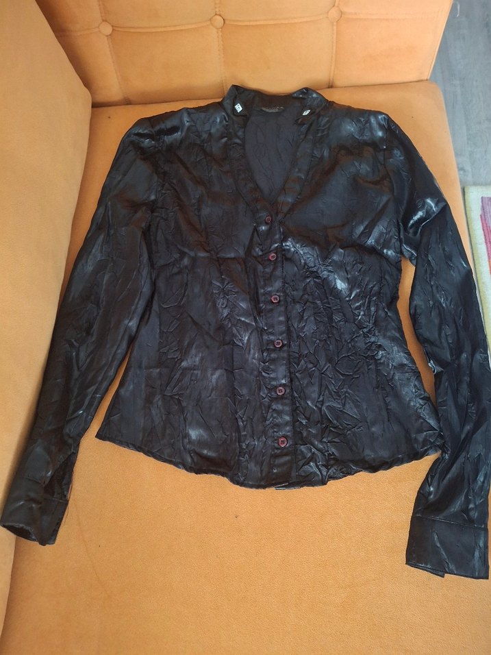 Düğmeli, siyah keten gömlek, notched lapel yaka ve uzun kolludur. Gotik tarzda, ofis kullanımı için uygundur.
