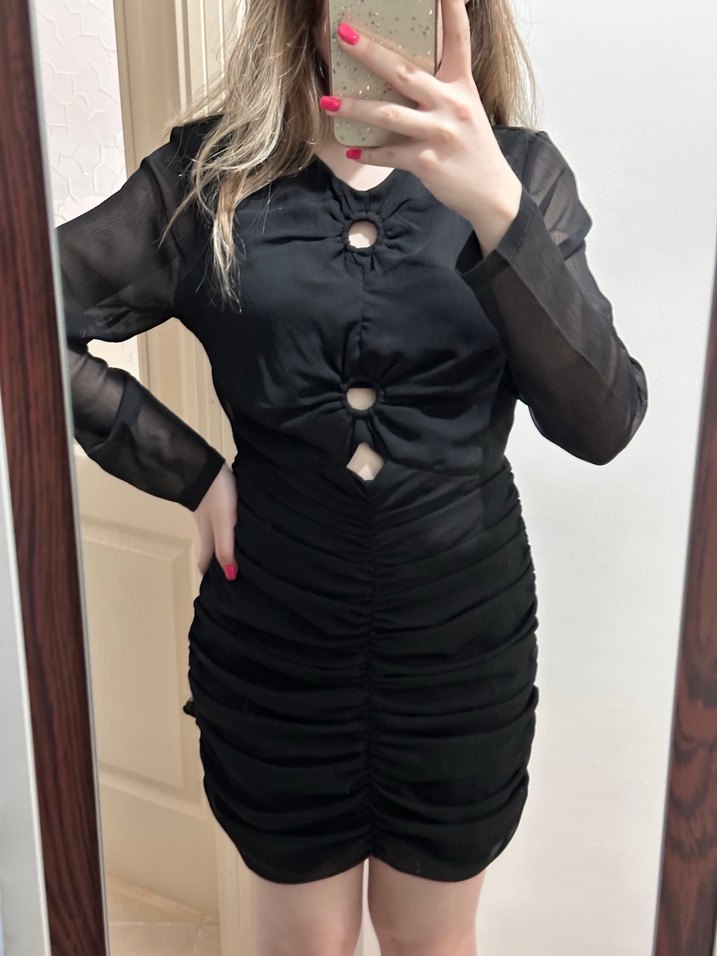 Siyah, düğmeli, V yakalı ve uzun şeffaf kollu, vücuda oturan midi elbise. Cesur gotik tarz ve romantik akşamlar için ideal. Hiç kullanılmadı tertemiz, etiketi mevcut değil