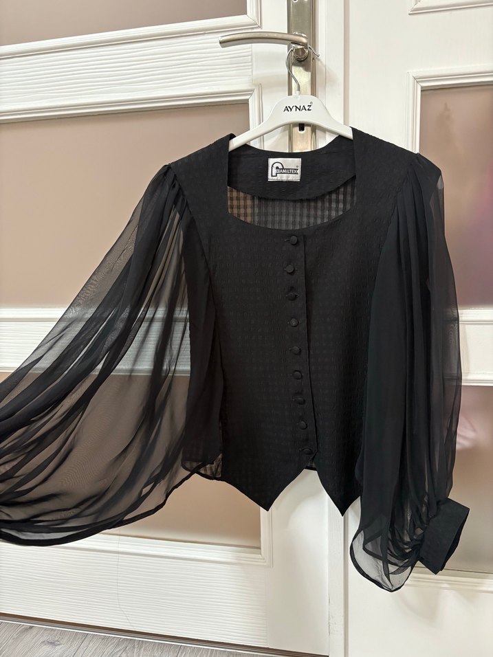Düğmeli, V yakalı, uzun transparan kollu, bol kesim siyah mini bluz. İpek gibi kumaştan, gotik tarzda ofis kullanımı için uygundur.