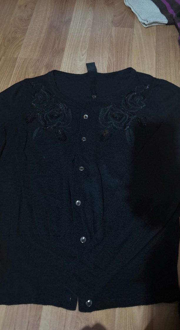 Düğmeli, uzun kollu, yuvarlak yakalı siyah triko hırka. Gotik tarzda nakış detayları ve bol kesimi ile günlük kullanıma uygundur.