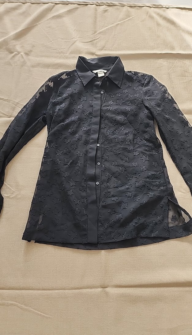 Siyah uzun kollu gömlek, düğmeli. Sentetik kumaştan üretilmiş, normal kesim ve yıldız desenlidir. Ofis için uygundur.