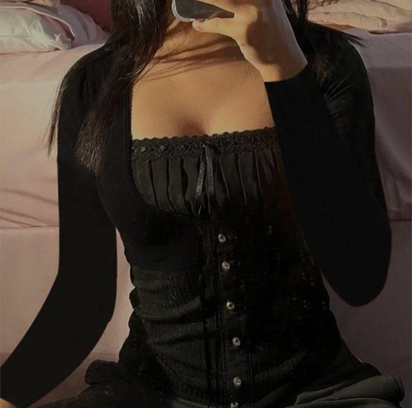 Düğmeli ön kısmı ve V yakası olan, sentetik kumaştan yapılmış siyah, vücuda oturan bluz. İnce askılı kolları ve midi boyu ile cesur gotik tarz yaratır.