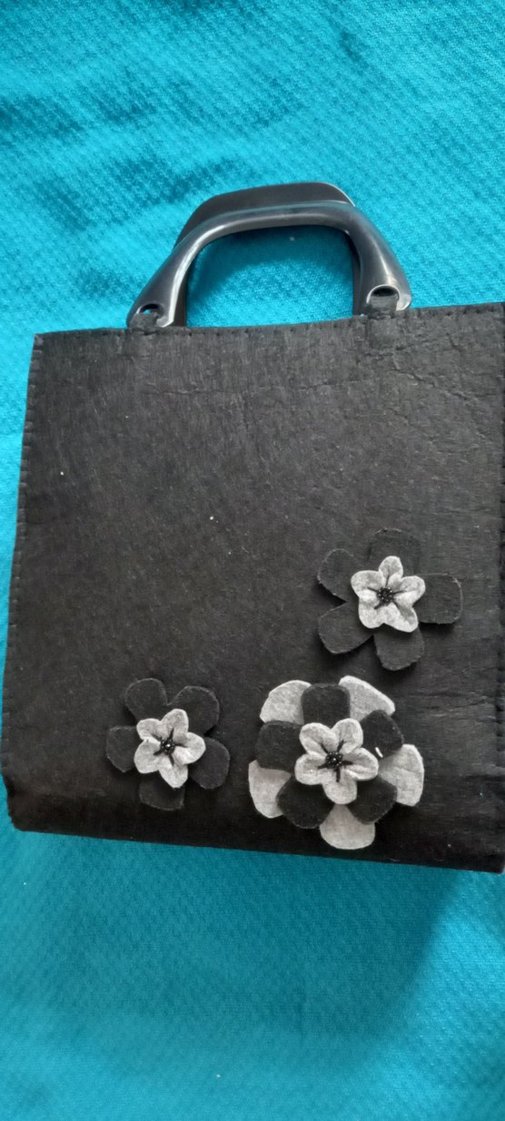 Siyah ve gri çiçek desenli, düğmeli detaylara sahip, yumuşak ve sıcak keçeden yapılmış kadın çantası. Sağlam sapları ve minimalist gotik tarzı bulunur.