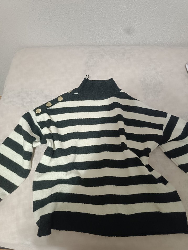 Düğmeli, uzun kollu, yüksek yakalı kadın triko. Siyah ve gri çizgili desenli, bol kesim, günlük sokak stili için uygundur.