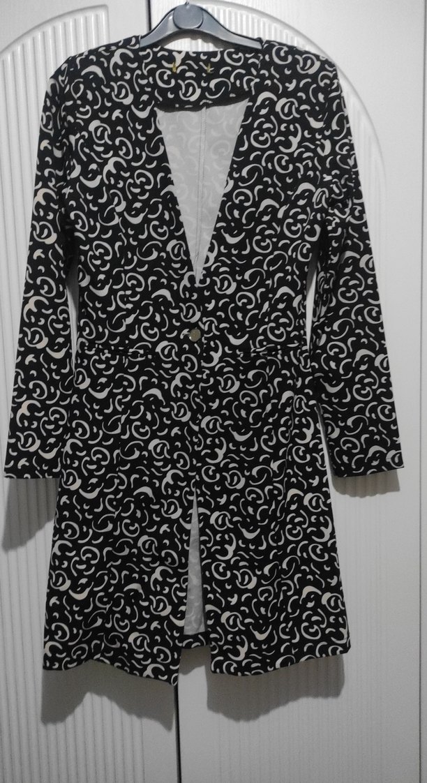 Kadınlar için düğmeli Siyah ve gri desenli, uzun kollu, sentetik kumaştan yapılmış, günlük rahat kullanım için uygun. Astarsız boy:87cm omuz:36cm tesettüre uygun