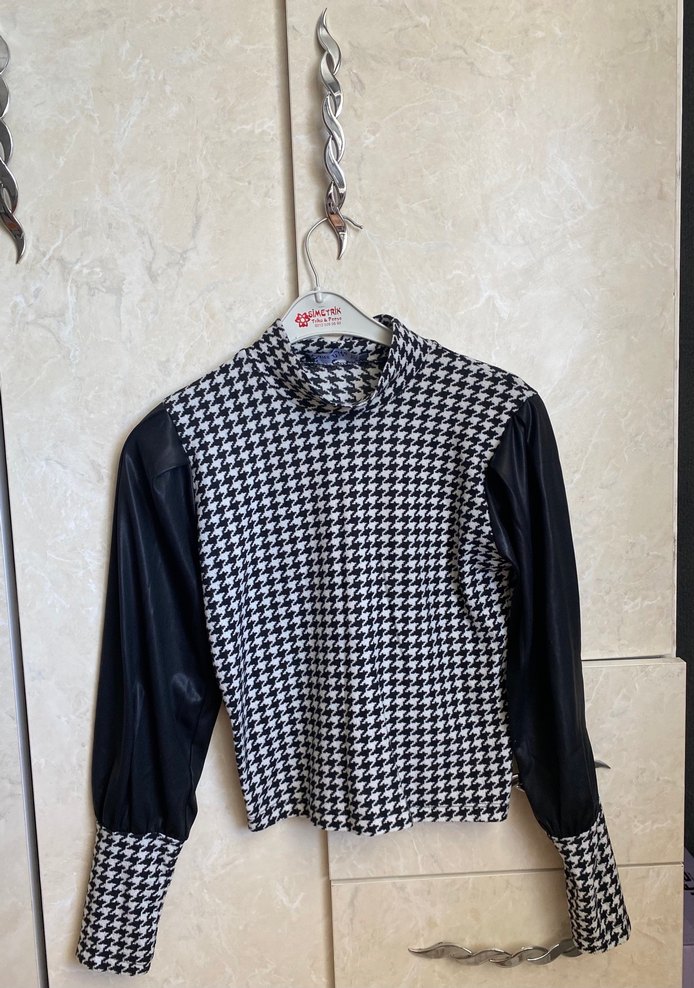 Kadınlar için yüksek yakalı, düğmeli manşetli uzun kollu bluz. Siyah ve gri kazayağı desenli, kısa boy ve regular fit, sentetik kumaştan yapılmıştır.