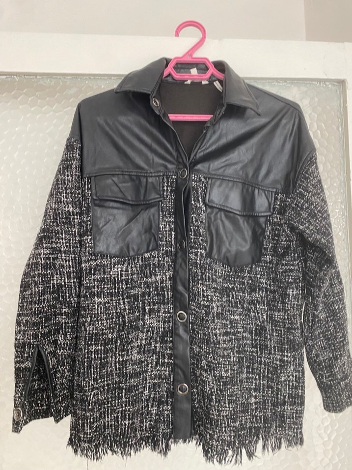 Düğmeli, notched lapel yakalı ve uzun kollu kadın ceket. Siyah ve gri tonlarda, sentetik kumaştan, kısa boyda ve regular fit kesimde, sokak stiline uygun.