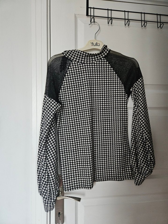 Yüksek yakalı, düğmeli uzun kollu kadın bluz, siyah gri ekose desenli ve bol kesimdir. Midi boyda, sentetik kumaştan, günlük kullanıma uygundur.