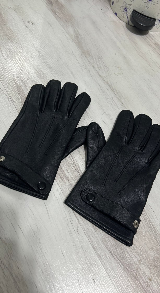 Düğmeli kayışlı siyah deri biker kadın eldiveni, klasik tarzda ve koyu renkte. Zamansız bir görünüm sağlar.