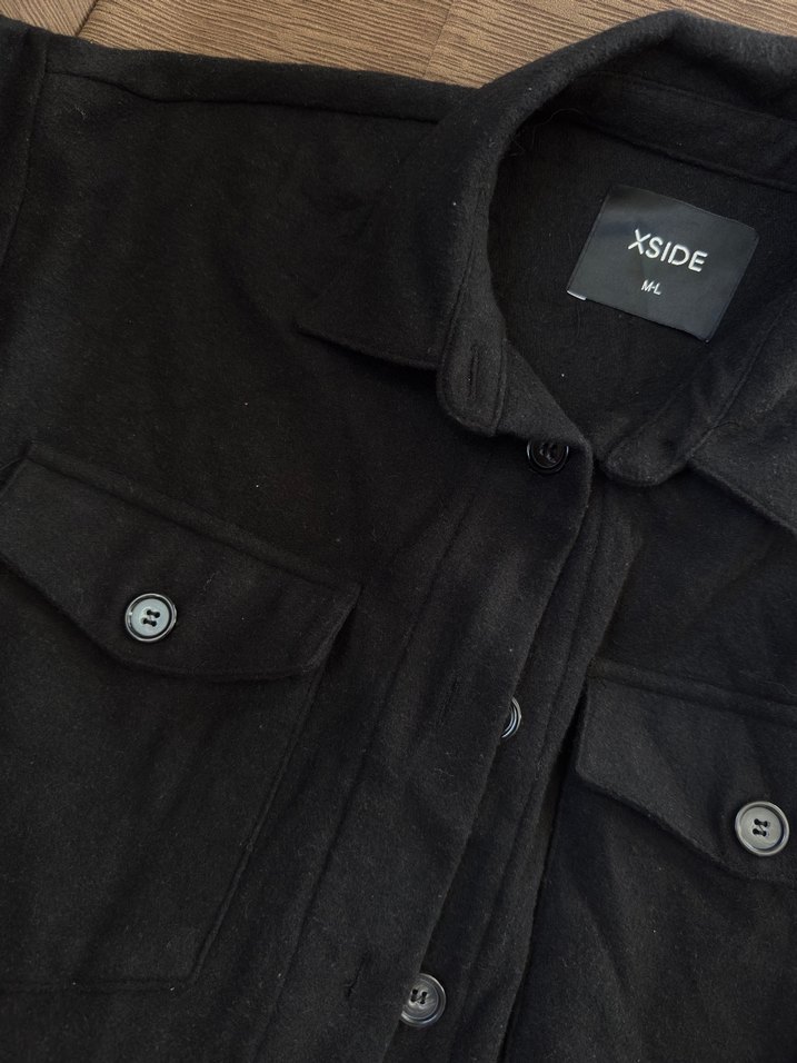 Düğmeli, siyah renkli kabanı. Normal uzunlukta, midi boyda, keten kumaştan, geniş kesim ve uzun kolludur. XSIDE markasına ait, sade ve günlük kullanıma uygundur.