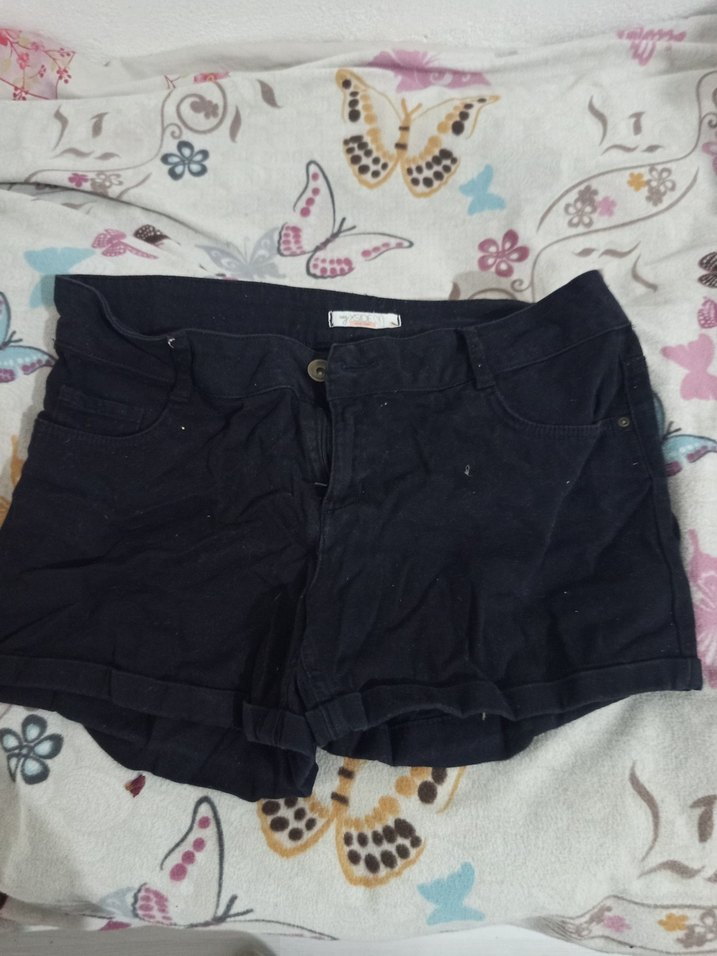 Düğmeli ön kısmı olan siyah, dar kesim hamile denim şort. Kısa boyu günlük ve sokak stiline uygundur.