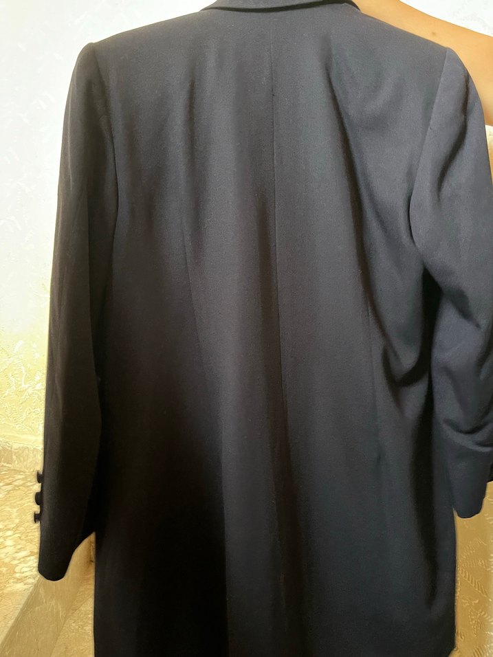 Düğmeli, siyah uzun hamile kaban, satenimsi kumaştan, klasik ofis şıklığı için uygun, uzun kollu ve regular fit.