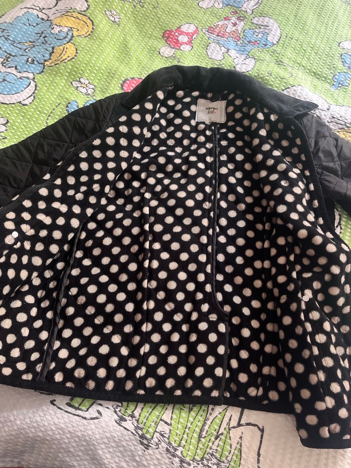 Düğmeli ve fermuarlı siyah puanlı, kumaştan yapılmış, normal boy midi uzunluğunda, uzun kollu, yaka tipi kesimli kadın ceketi. 8-9 yaşa uygun kız çocuk mont mevsim geçişleri için ideal .