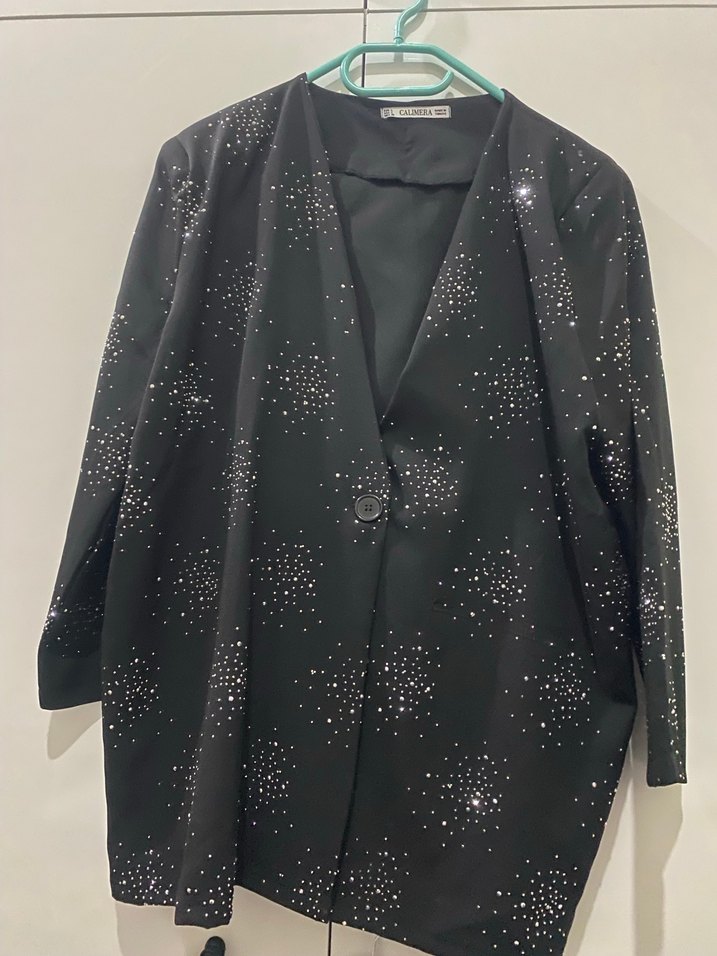 Siyah midi blazer, düğmeli ve kesik yakalıdır. Uzun kollu ve baskılı taş detaylı desene sahiptir. Sentetik kumaştan üretilmiş, Sıfır ürün çok şık ceket göğüs en 65 cm boy 73 cm pantolon boy 80 bel 40 ama lastikli 50-55 kadar esner paça 20 cm taş detaylı uygun rahat kesimlidir. ✨marka temsilidir