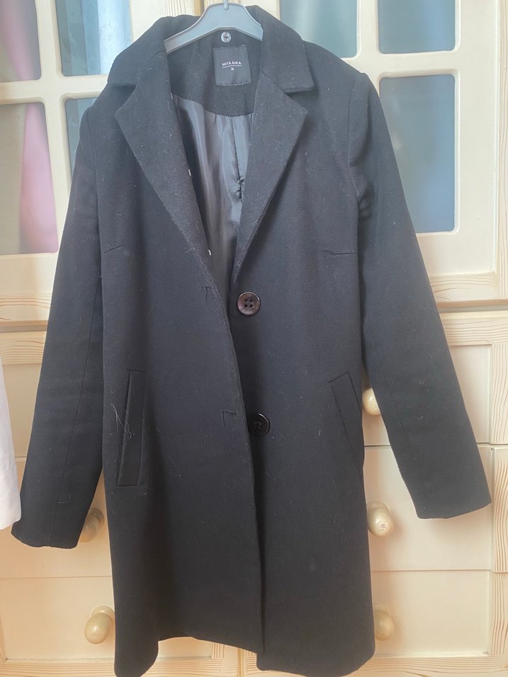 Düğmeli kapamalı, klasik yakalı siyah kaban. Uzun kollu ve yan cepli, düz dokulu kumaştan yapılmıştır. Hic bir sorunu yoktur hiç kullanmadım